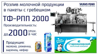 Автомат карусельно-линейного типа «ТФ-РПП 1800» предназначен для фасовки и упаковки жидких молочных продуктов в прямоугольные пакеты с гребешком из высокоплотного картона с двусторонним полиэтиленовым покрытием. Работа автомата включает процесс формирования пакета из плоской заготовки, приварку сливного штуцера к пакету ультразвуком (по потребности), точное объемное дозирование продукта, герметичное запечатывание пакета и нанесение даты.